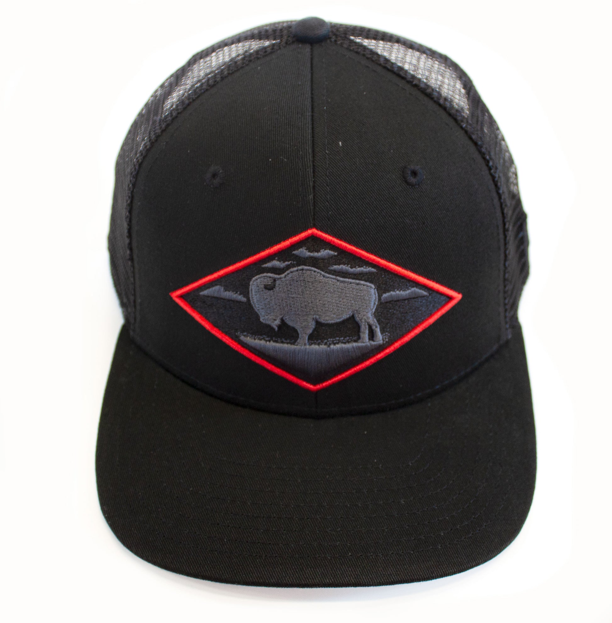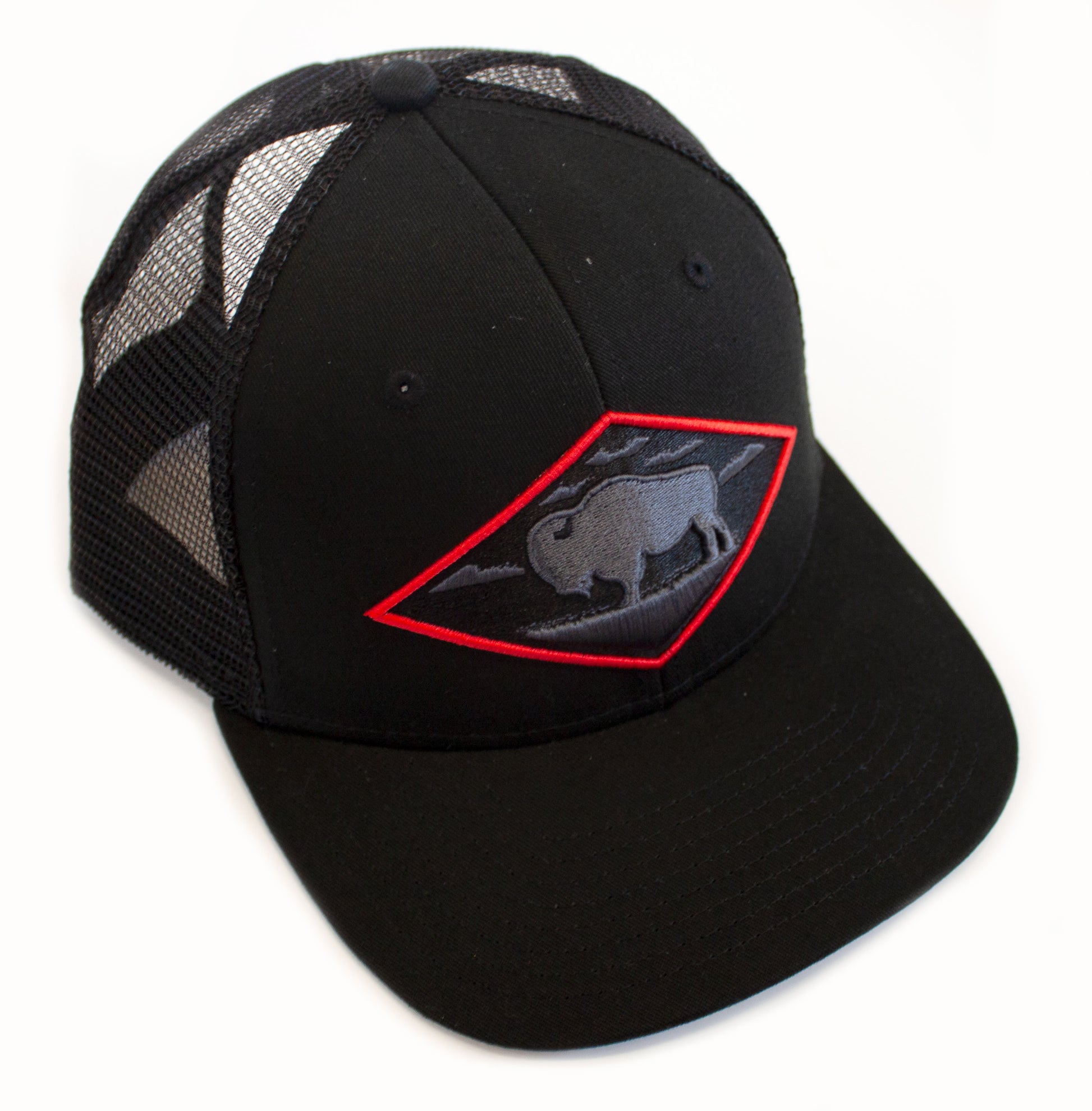 Classic trucker cap style with black front and black mesh back, with adjustable snapback. Black and red logo.